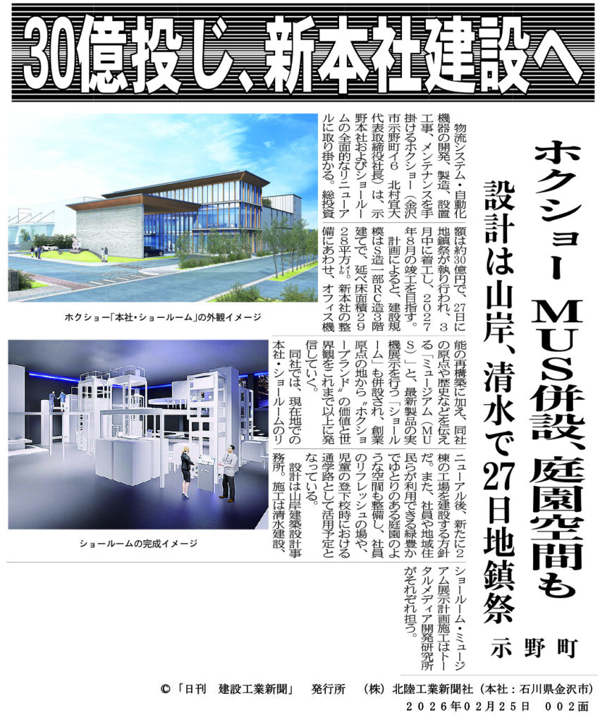 弊社が設計を担当しましたホクショー様の新本社建設の記事が建設工業新聞に掲載されました。